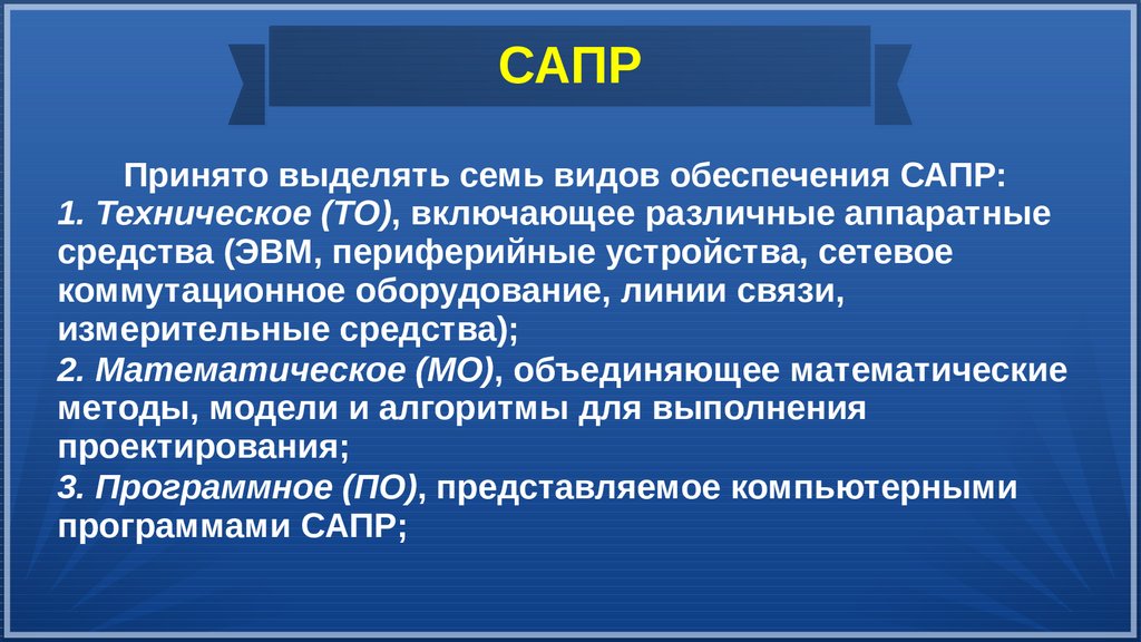 САПРПринято выделять семь видов обеспечения САПР: