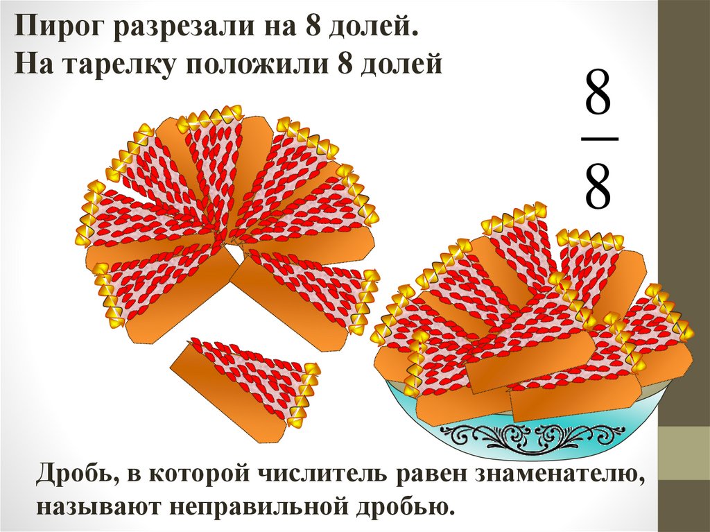 Пирог разрезали на 8 долей.На тарелку положили 8 долей