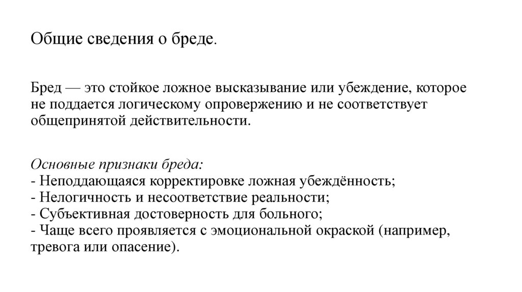 Общие сведения о бреде.Бред — это стойкое ложное высказывание или убеждение, которое