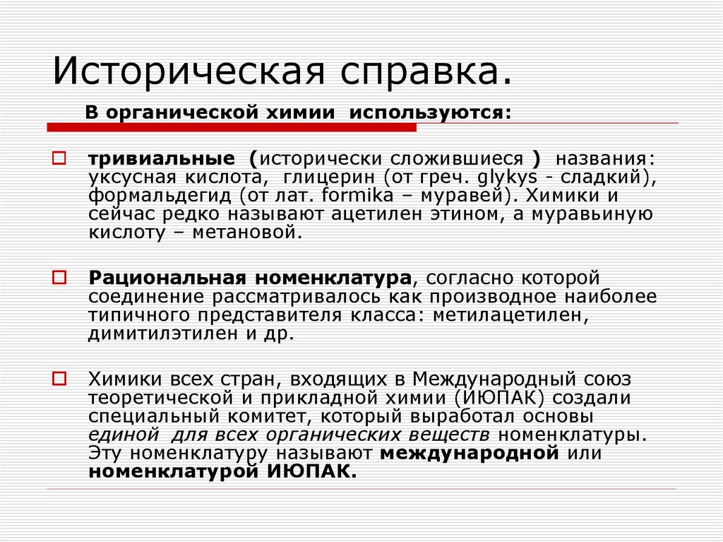 Историческая справка.В органической химии используются:
