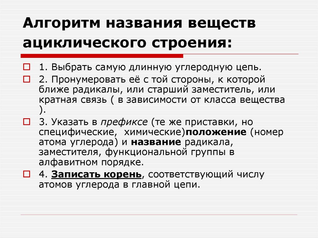1. Выбрать самую длинную углеродную цепь.