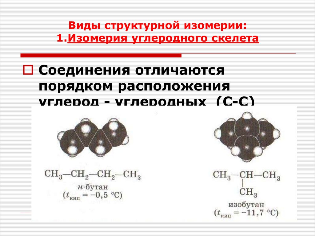 Виды структурной изомерии:1.Изомерия углеродного скелета