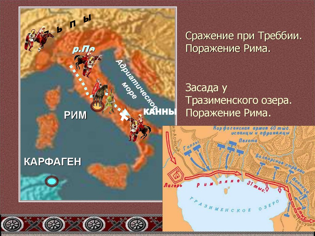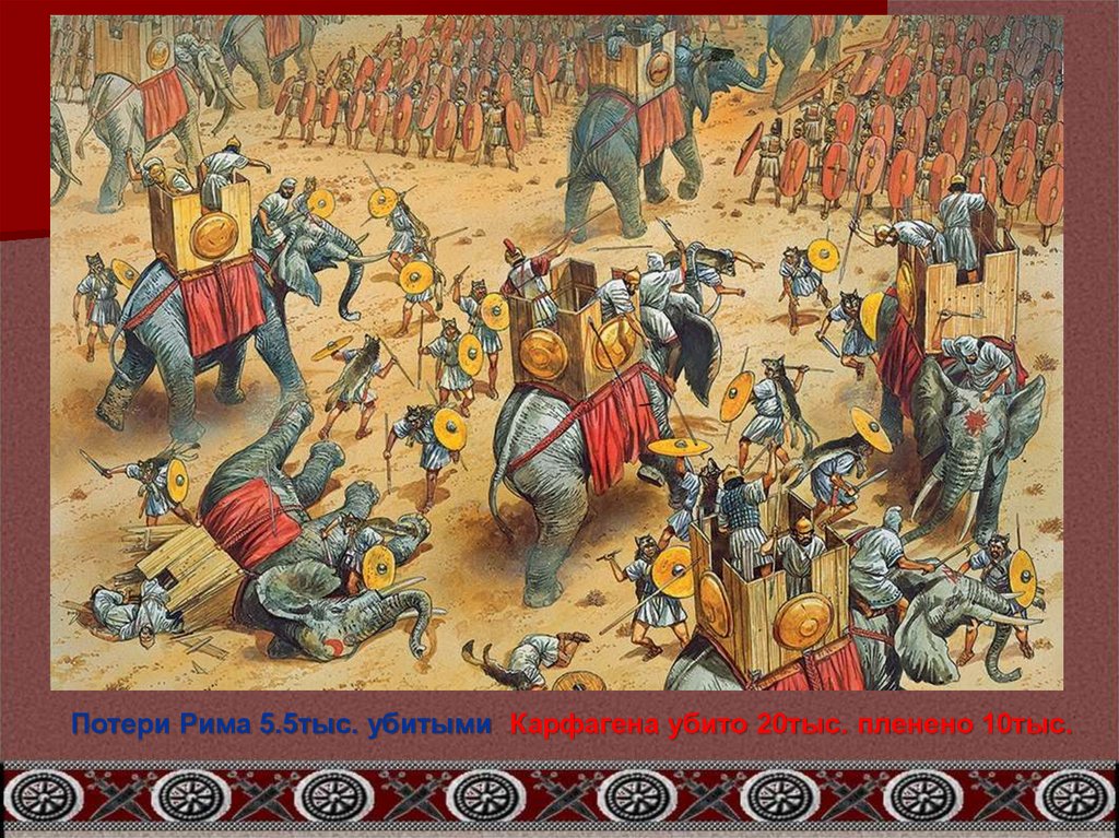 Потери Рима 5.5тыс. убитыми Карфагена убито 20тыс. пленено 10тыс.25.