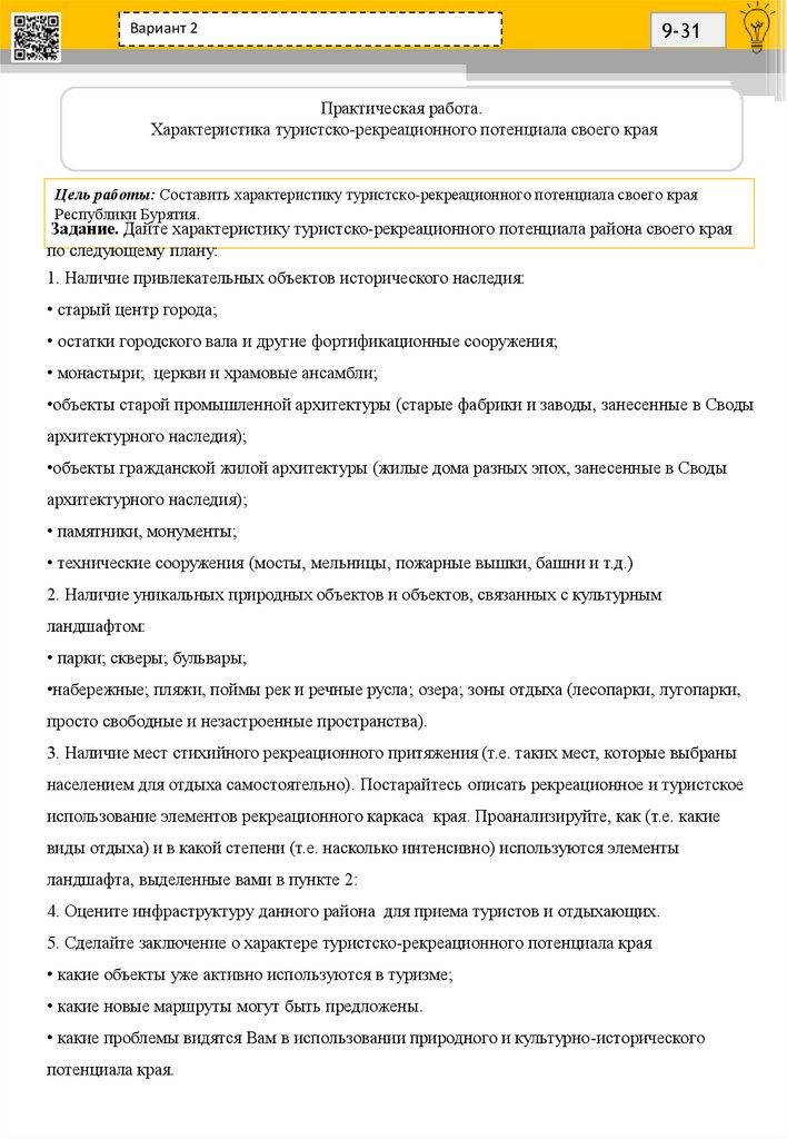 Задание. Дайте характеристику туристско-рекреационного потенциала района своего края