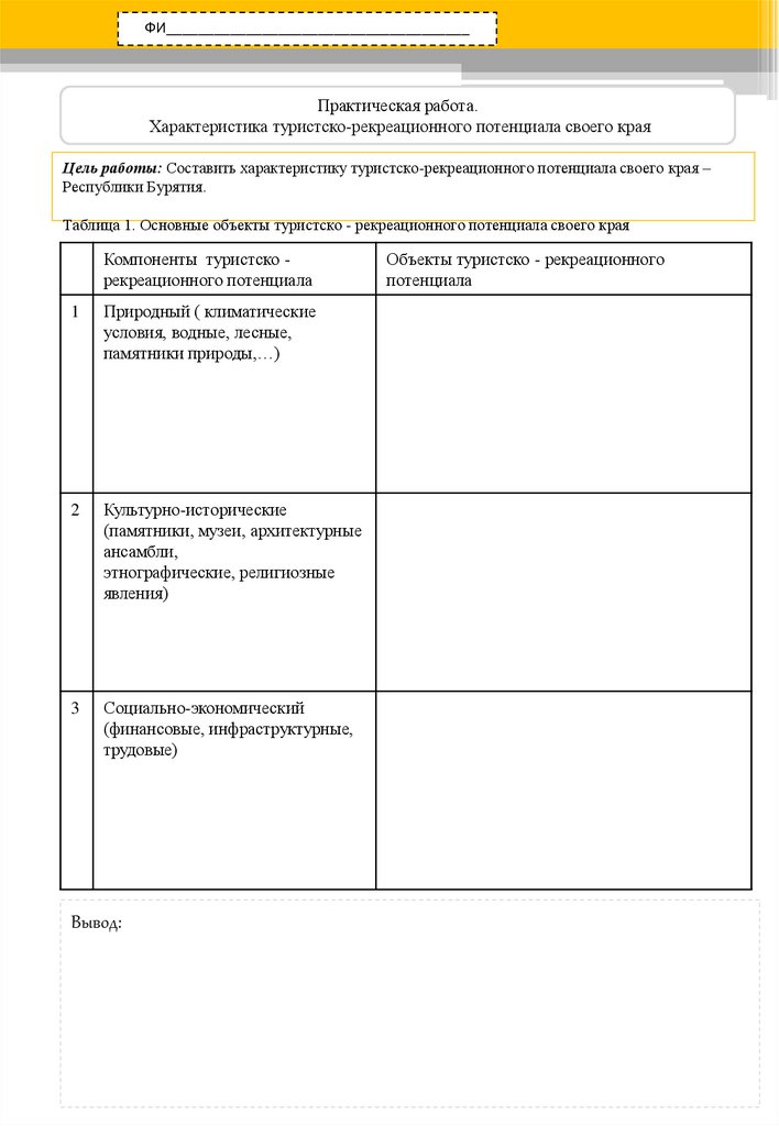 Цель работы: Составить характеристику туристско-рекреационного потенциала своего края