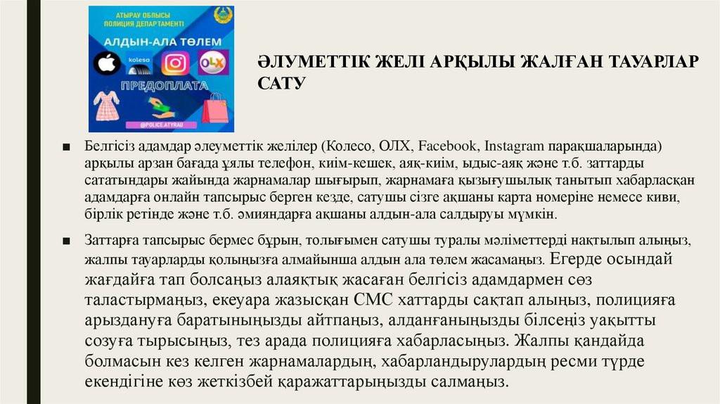 ■ Белгісіз адамдар «Facebook, Instagram, Telegram, Тik-Tok, ОЛХ, Колесо» парақшаларына әртүрлі ойындарға, пайдалы жобаларға қаражат салу арқылы ақша көбейте алатындары туралыжарнамалар шығарады. Сіз сол жарияланған жарнамаға сеніп, белгісіз адамдармен байланыс