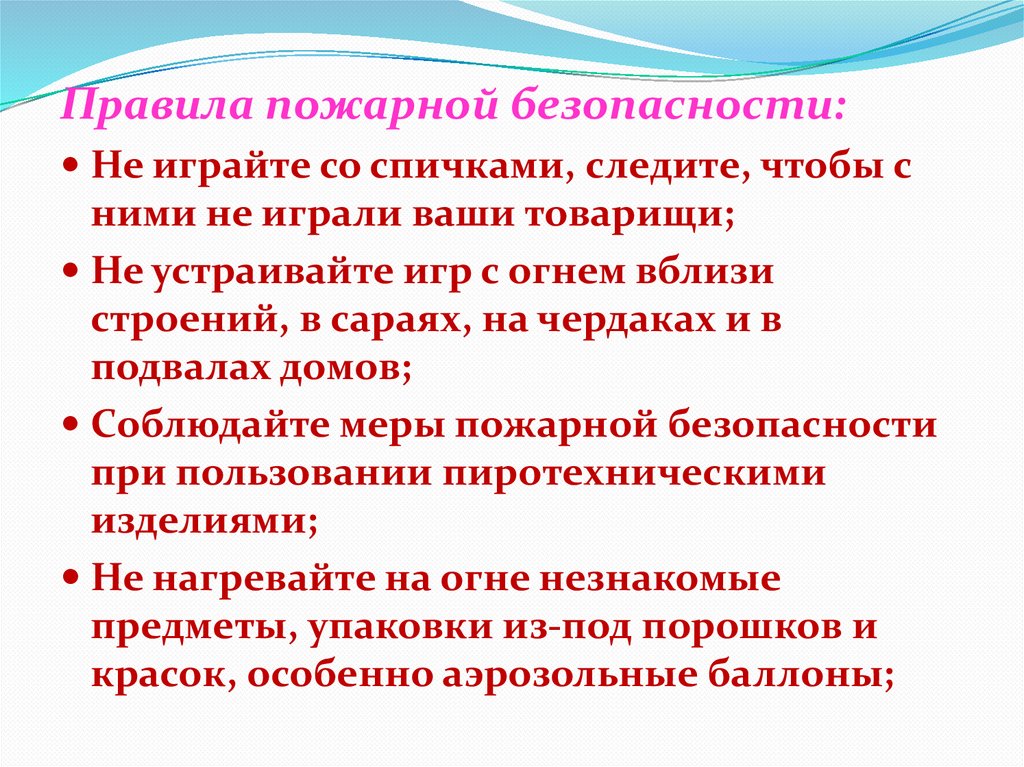 Правила пожарной безопасности:Не играйте со спичками, следите, чтобы с
