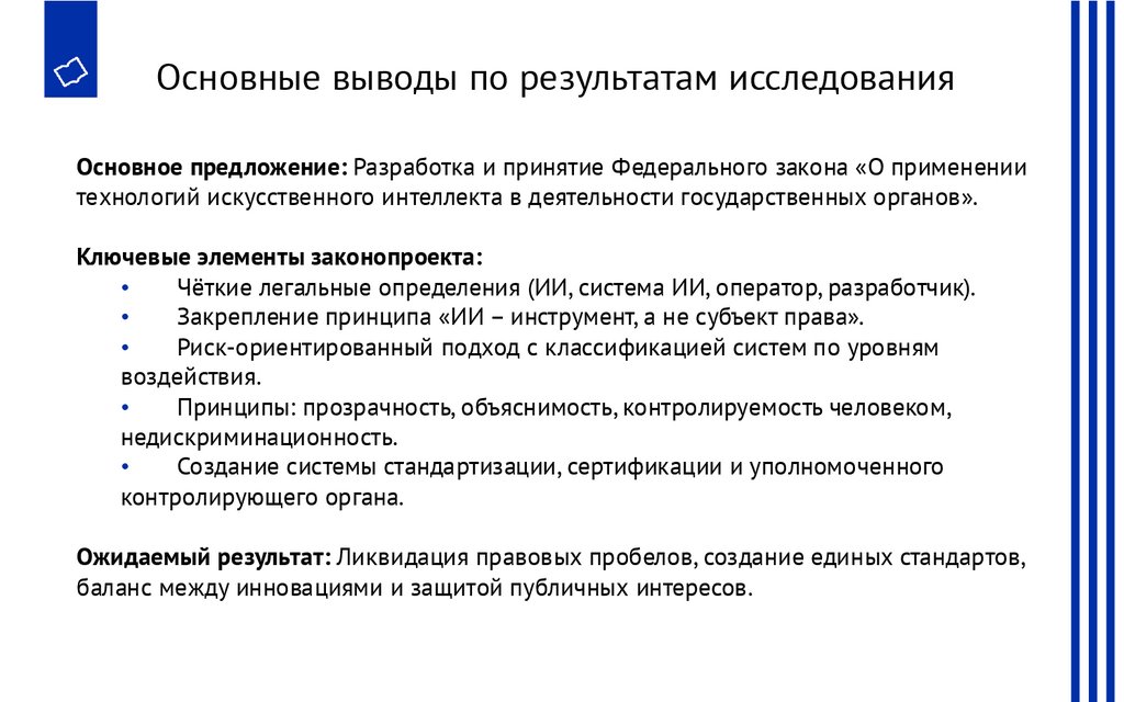 Основные выводы по результатам исследованияОсновное предложение: Разработка и принятие Федерального закона «О применении