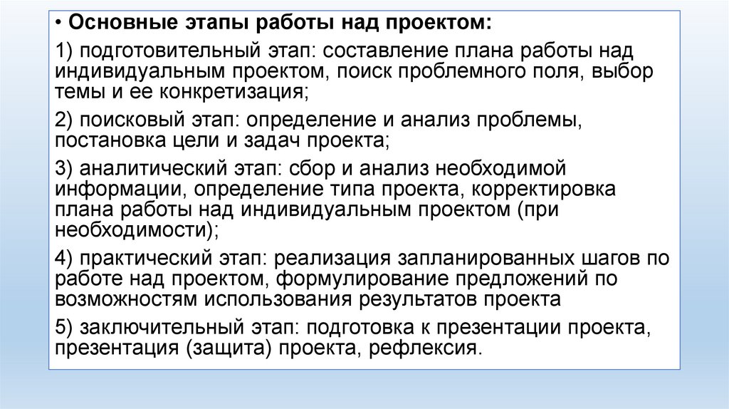 • Основные этапы работы над проектом:1) подготовительный этап: составление плана работы над