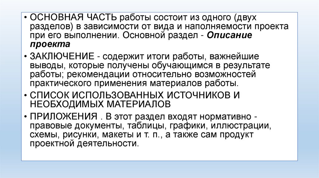 • ОСНОВНАЯ ЧАСТЬ работы состоит из одного (двухразделов) в зависимости от вида и наполняемости проекта