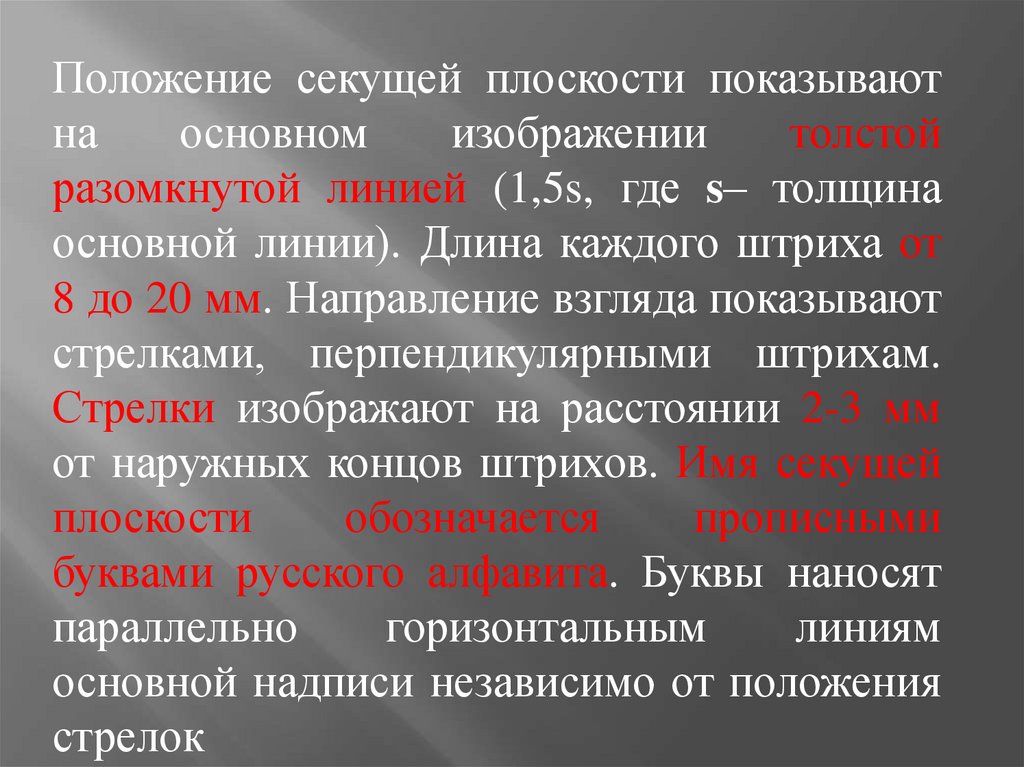 Положение секущей плоскости показываютна