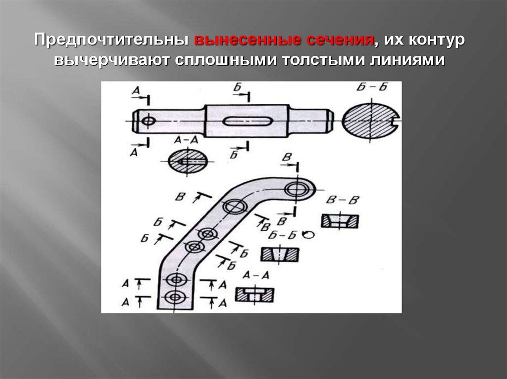 Предпочтительны вынесенные сечения, их контурвычерчивают сплошными толстыми линиями