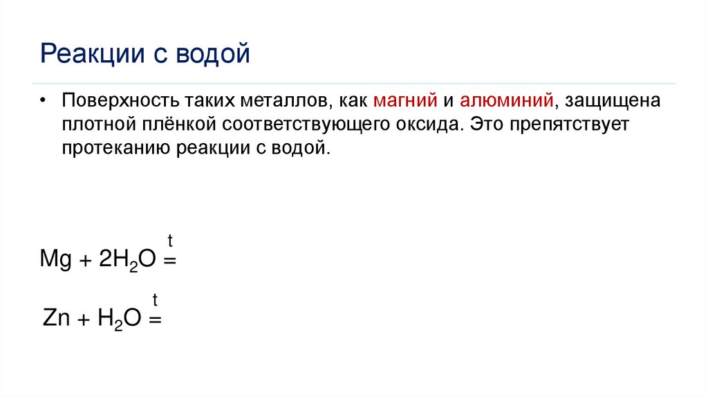 Реакции с водой• Поверхность таких металлов, как магний и алюминий, защищена