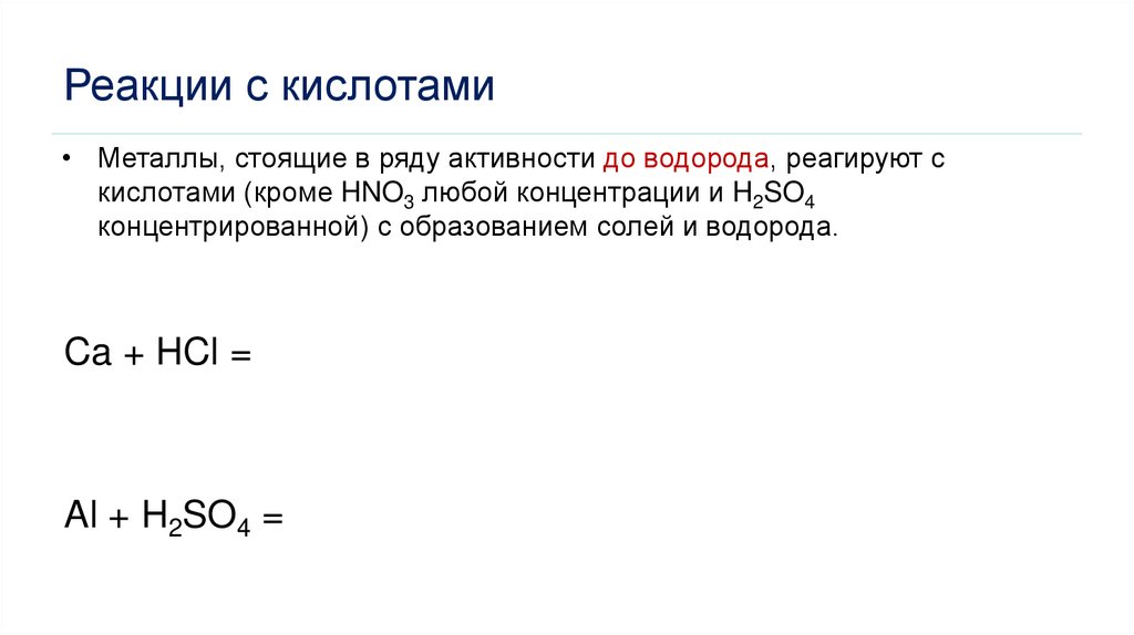 Реакции с кислотами• Металлы, стоящие в ряду активности до водорода, реагируют с