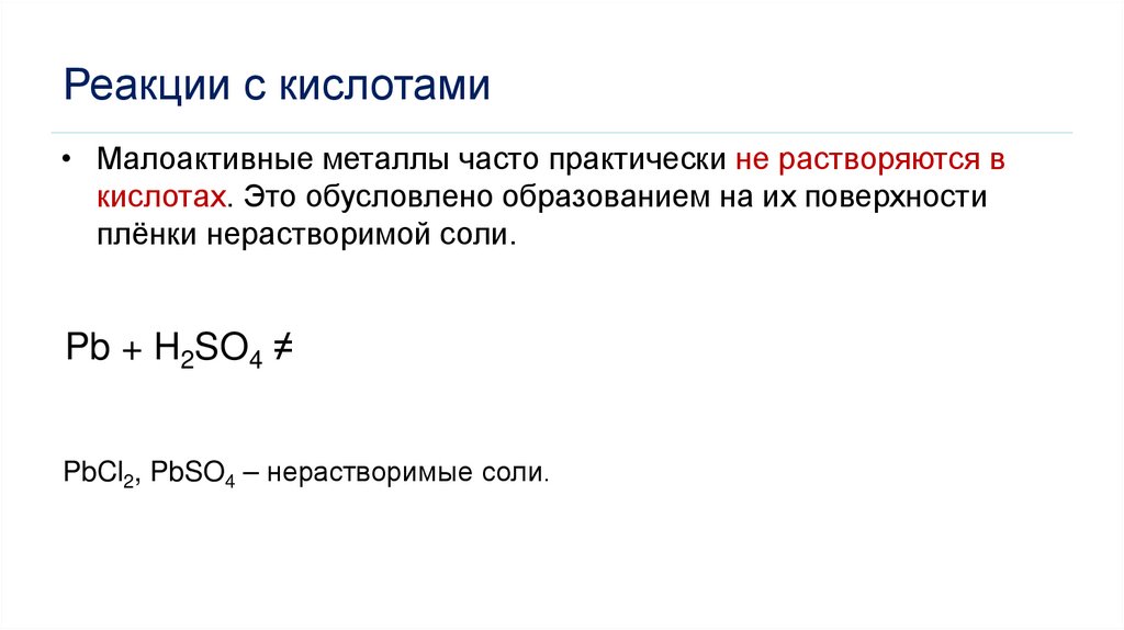 Реакции с кислотами• Малоактивные металлы часто практически не растворяются в