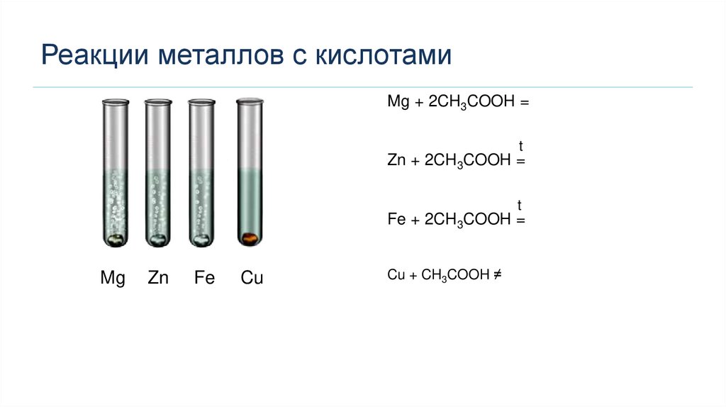 Реакции металлов с кислотамиMg + 2CH3COOH =