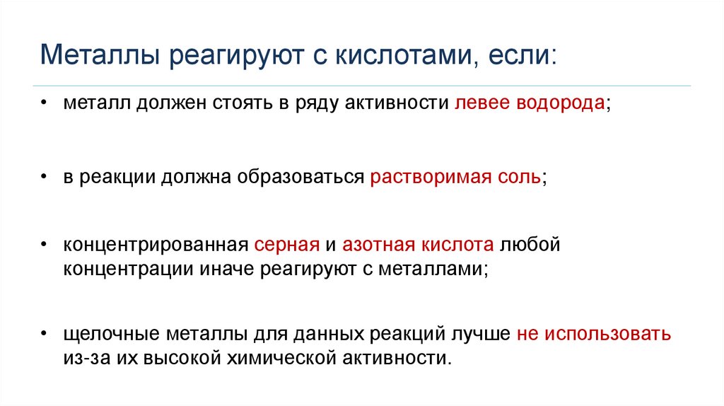 Металлы реагируют с кислотами, если:• металл должен стоять в ряду активности левее водорода;