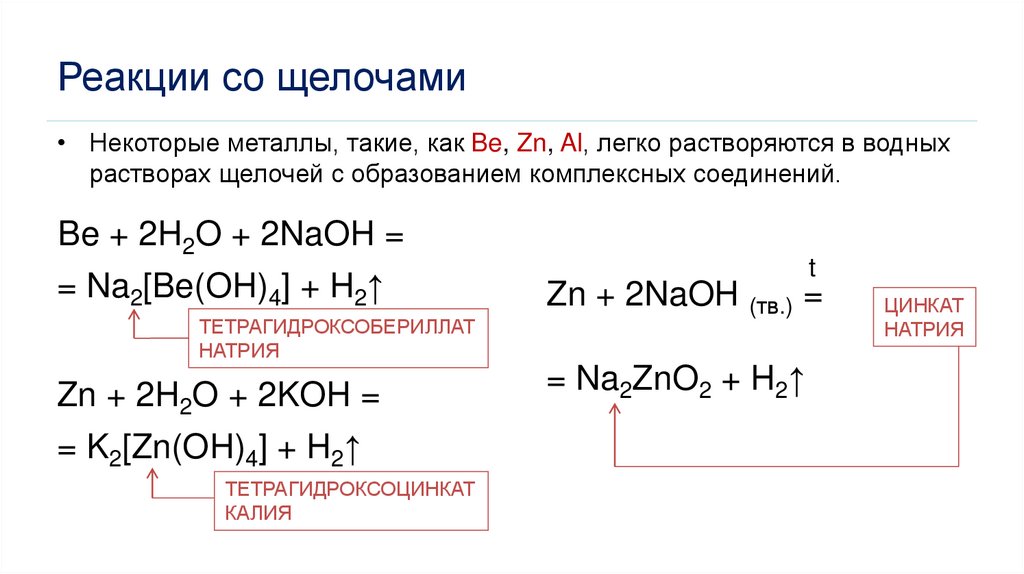 Реакции со щелочами• Некоторые металлы, такие, как Be, Zn, Al, легко растворяются в водных