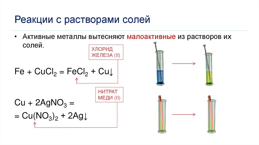 Реакции с растворами солей• Активные металлы вытесняют малоактивные из растворов их