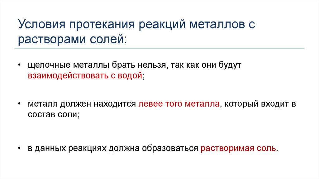 Условия протекания реакций металлов срастворами солей: