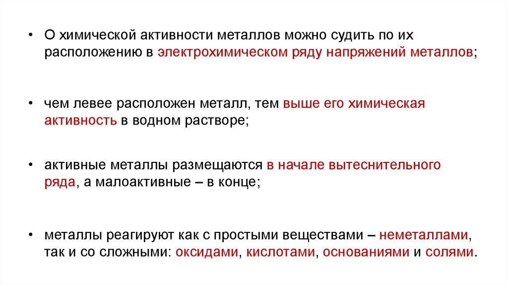 • О химической активности металлов можно судить по ихрасположению в электрохимическом ряду напряжений металлов;