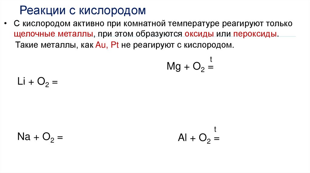 Реакции с кислородом• С кислородом активно при комнатной температуре реагируют только