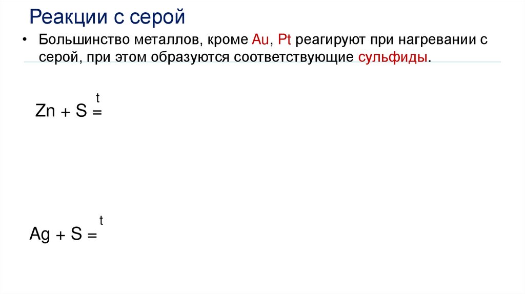 Реакции с серой• Большинство металлов, кроме Au, Pt реагируют при нагревании с