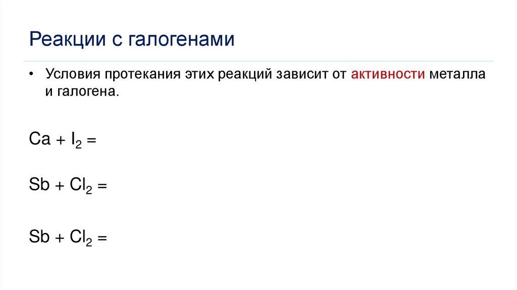 Реакции с галогенами• Условия протекания этих реакций зависит от активности металла
