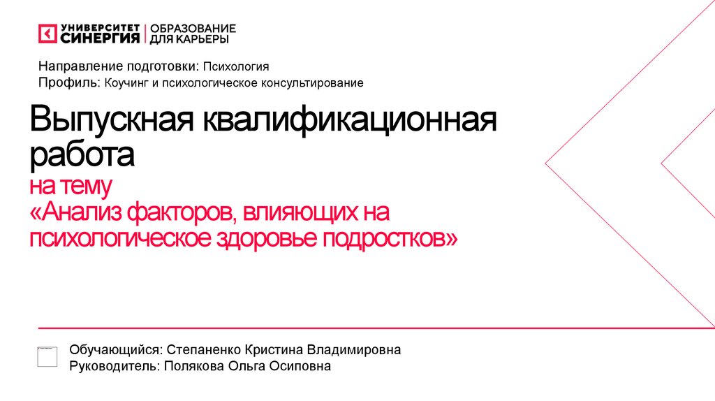 Направление подготовки: ПсихологияПрофиль: Коучинг и психологическое консультирование