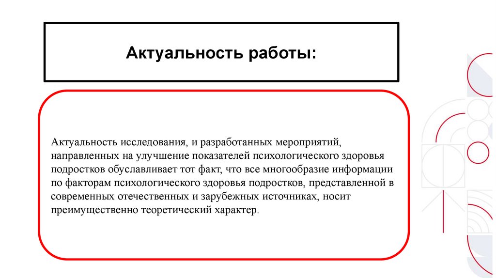 Актуальность работы:Актуальность исследования, и разработанных мероприятий,