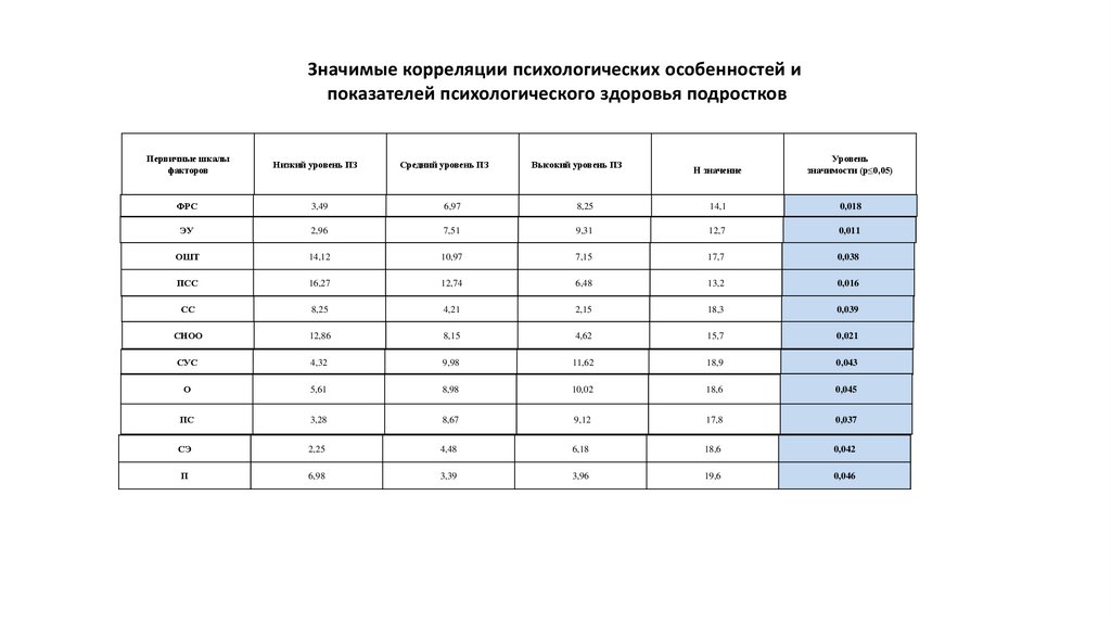 Значимые корреляции психологических особенностей ипоказателей психологического здоровья подростков