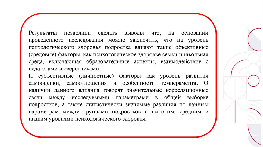 Результаты позволили сделать выводы что, на основаниипроведенного исследования можно заключить, что на уровень