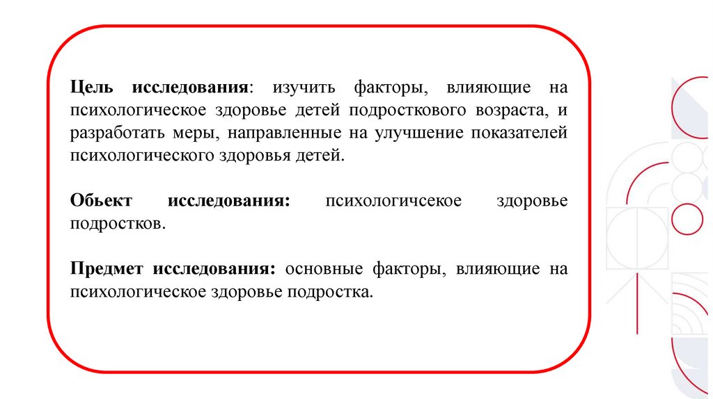 Цель исследования: изучить факторы, влияющие напсихологическое здоровье детей подросткового возраста, и