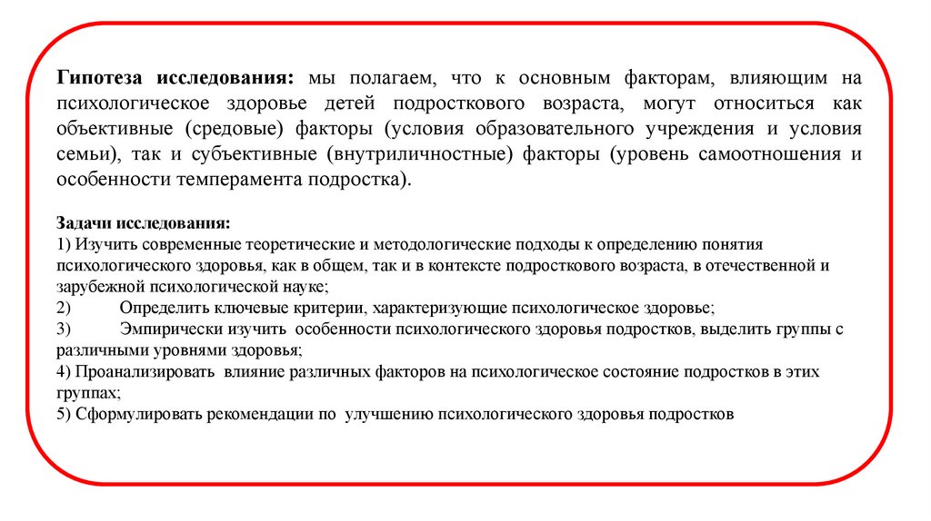 Гипотеза исследования: мы полагаем, что к основным факторам, влияющим напсихологическое здоровье детей подросткового возраста, могут относиться как