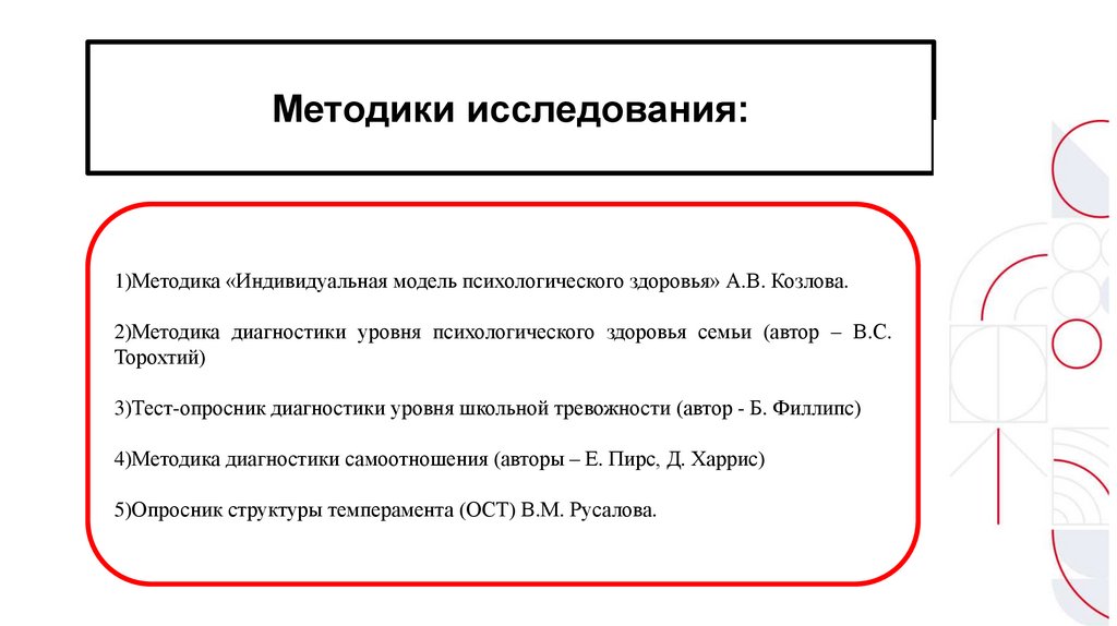Методики исследования:1)Методика «Индивидуальная модель психологического здоровья» А.В. Козлова.