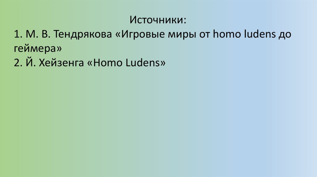 Источники:1. М. В. Тендрякова «Игровые миры от homo ludens до