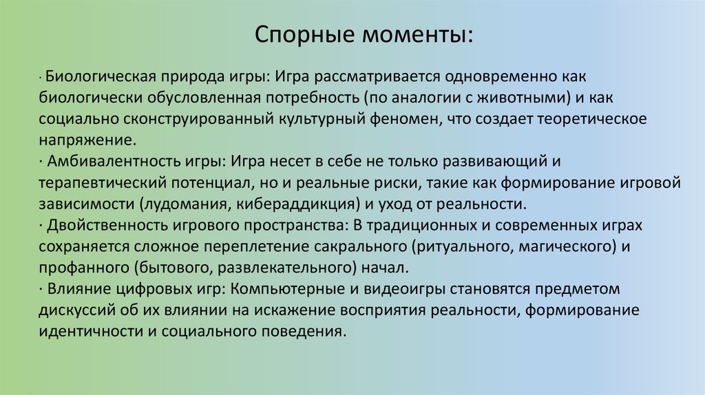 Спорные моменты:· Биологическая природа игры: Игра рассматривается одновременно как