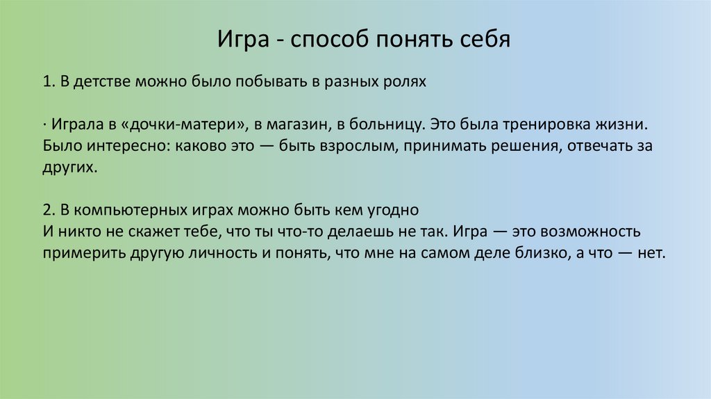 Игра - способ понять себя1. В детстве можно было побывать в разных ролях
