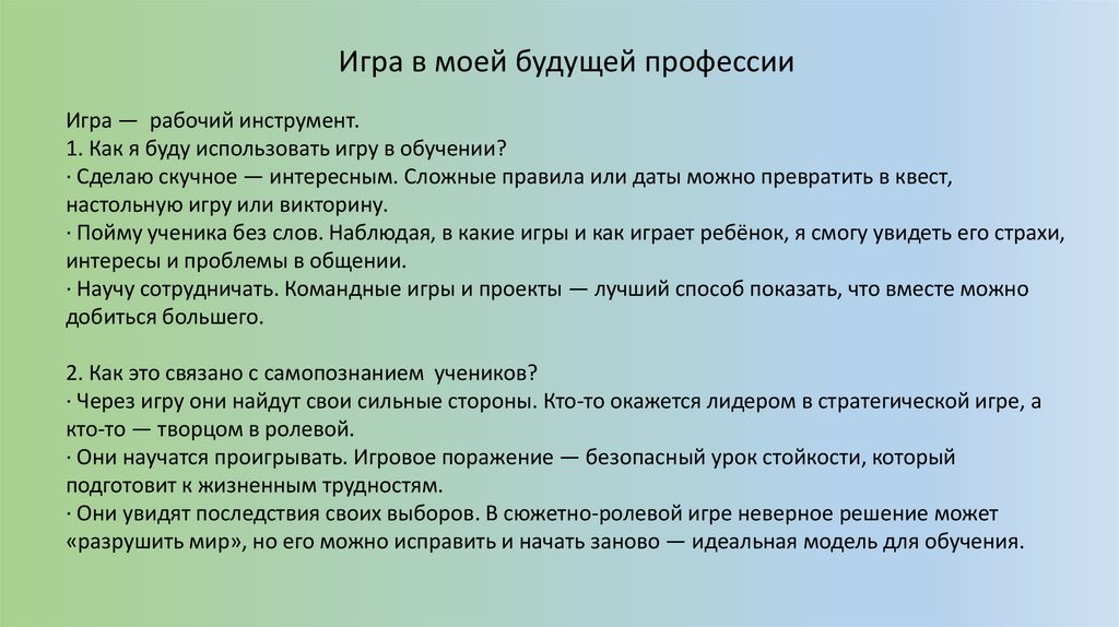 Игра в моей будущей профессииИгра — рабочий инструмент.