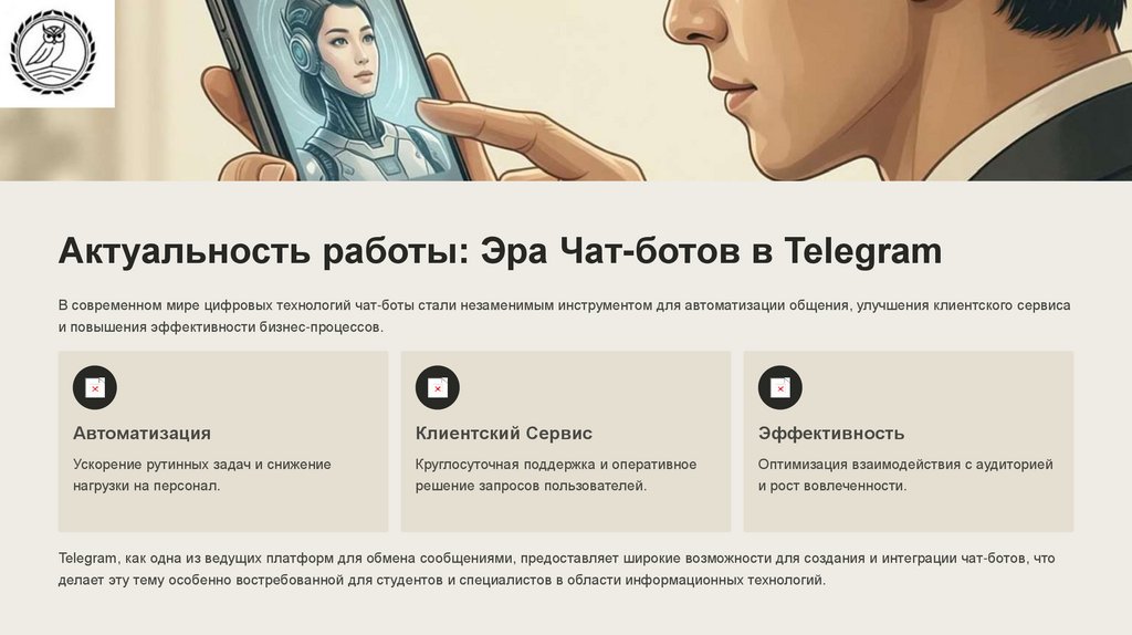 Актуальность работы: Эра Чат-ботов в TelegramВ современном мире цифровых технологий чат-боты стали незаменимым инструментом для автоматизации общения, улучшения клиентского сервиса