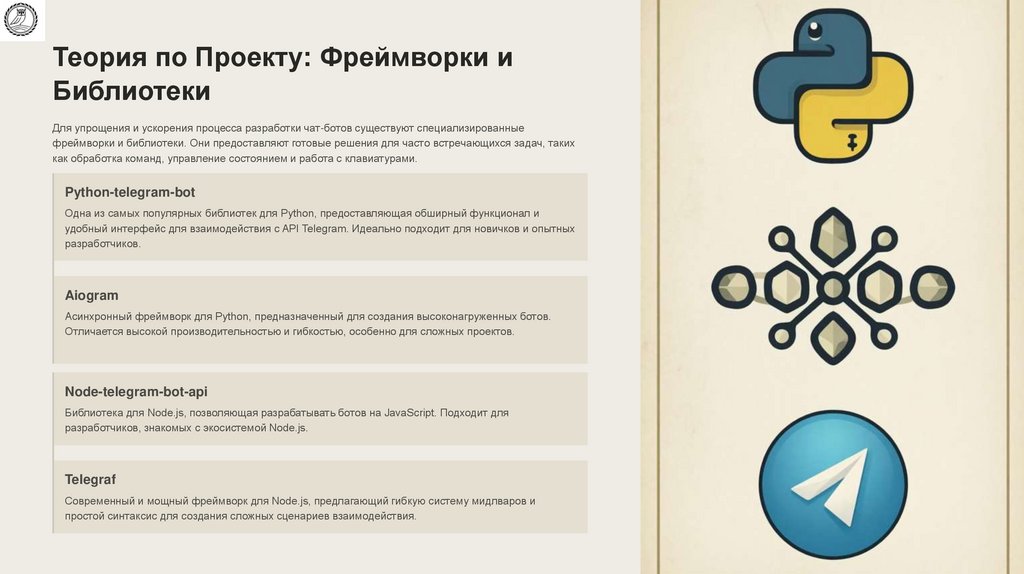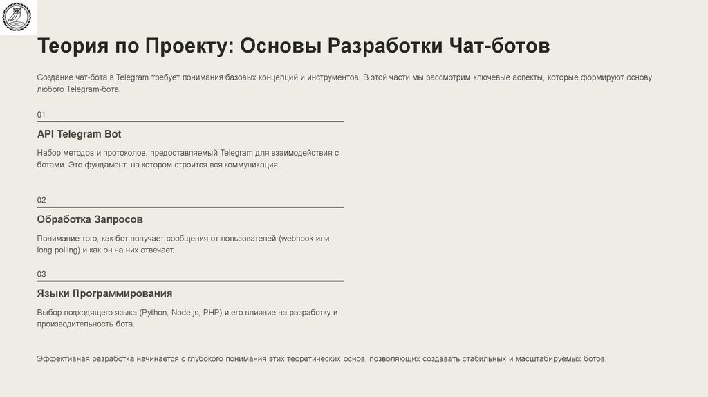 Теория по Проекту: Основы Разработки Чат-ботовСоздание чат-бота в Telegram требует понимания базовых концепций и инструментов. В этой части мы рассмотрим ключевые аспекты, которые формируют основу