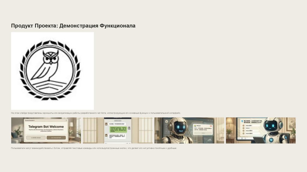 Продукт Проекта: Демонстрация ФункционалаНа этом слайде представлены скриншоты или визуализации работы разработанного чат-бота, иллюстрирующие его основные функции и пользовательский интерфейс.