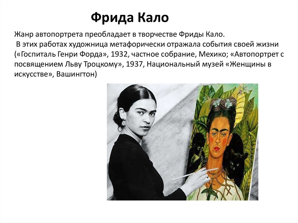 Фрида КалоЖанр автопортрета преобладает в творчестве Фриды Кало.