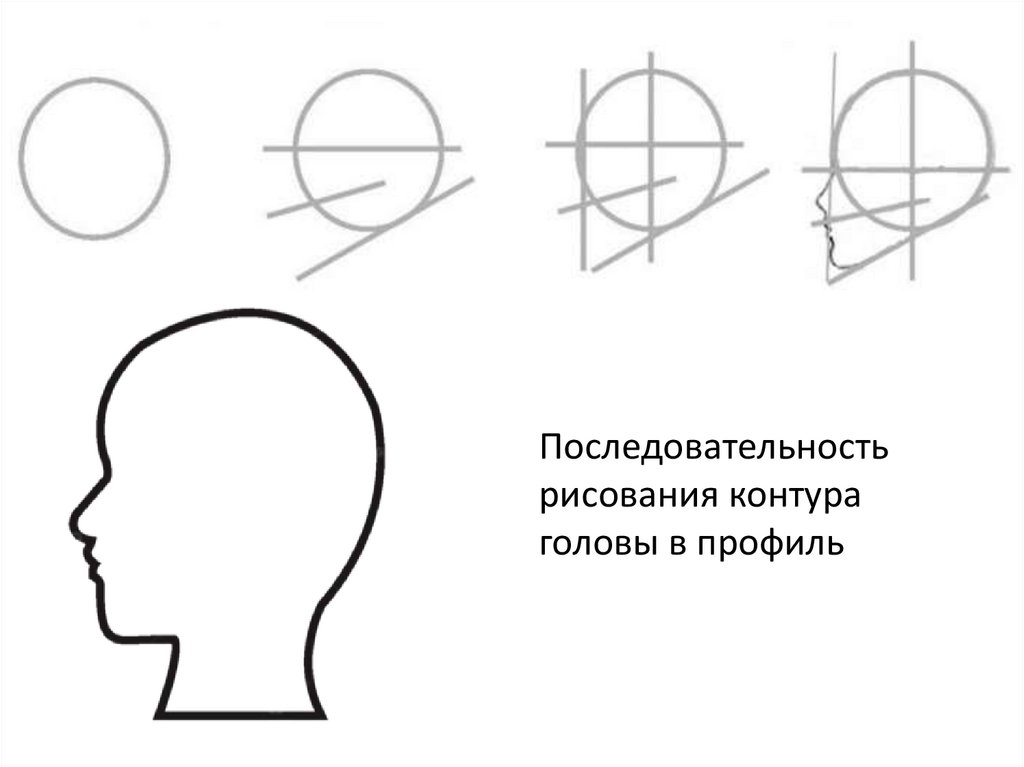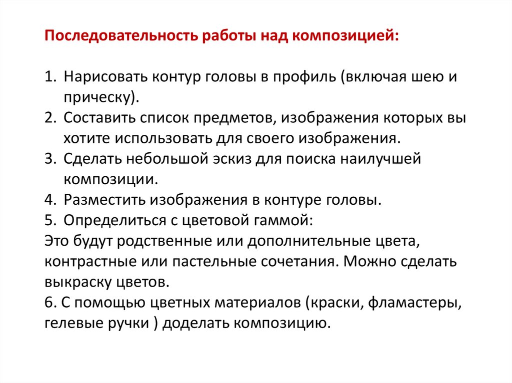 Последовательность работы над композицией:1. Нарисовать контур головы в профиль (включая шею и