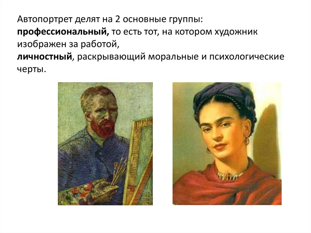 Автопортрет делят на 2 основные группы:профессиональный, то есть тот, на котором художник