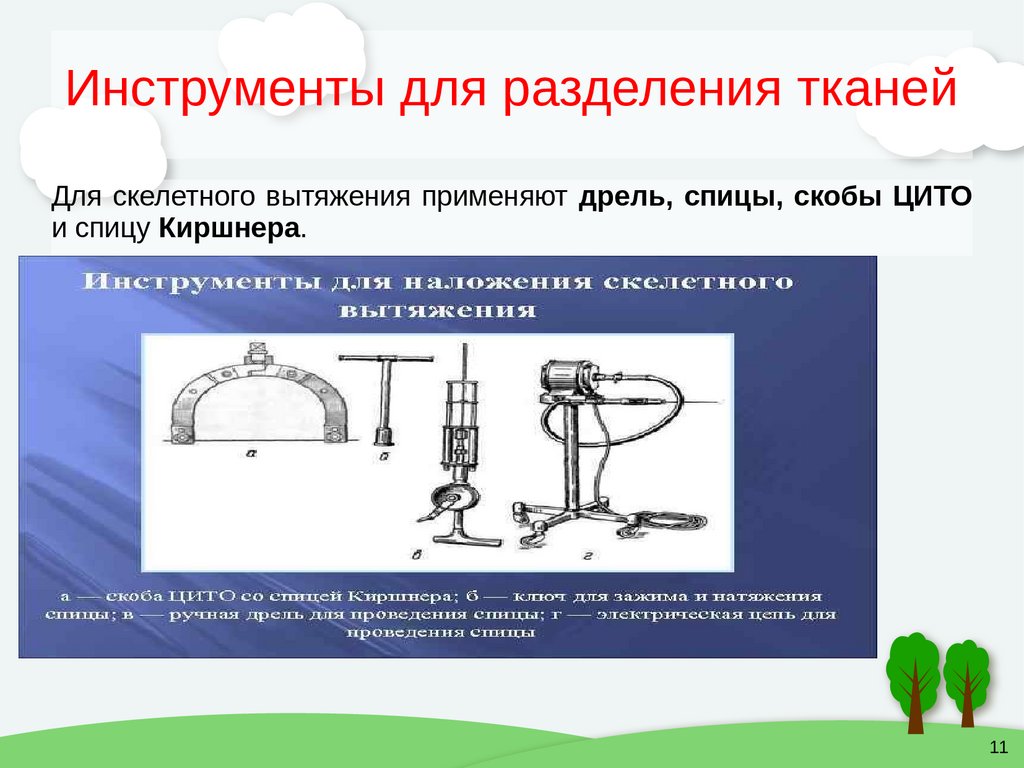 Инструменты для разделения тканейДля скелетного вытяжения применяют дрель, спицы, скобы ЦИТО