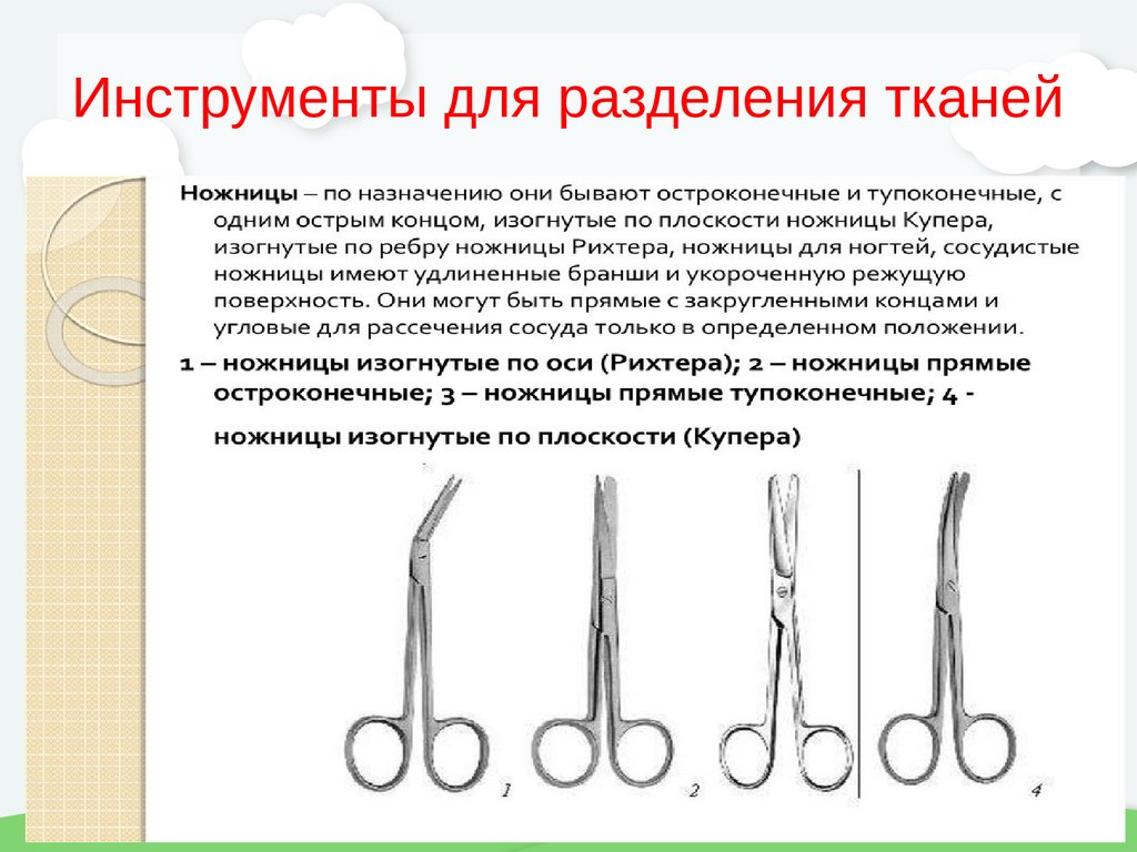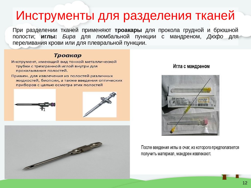 Инструменты для разделения тканейПри разделении тканей применяют троакары для прокола грудной и брюшной