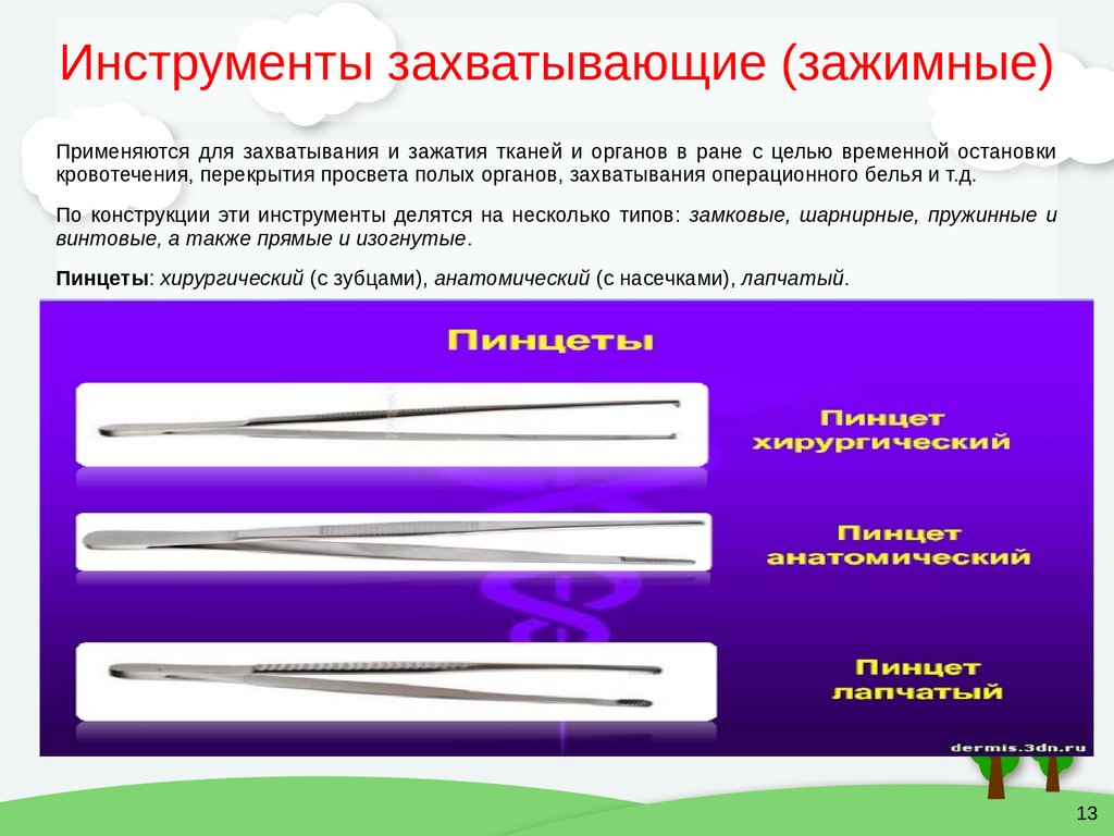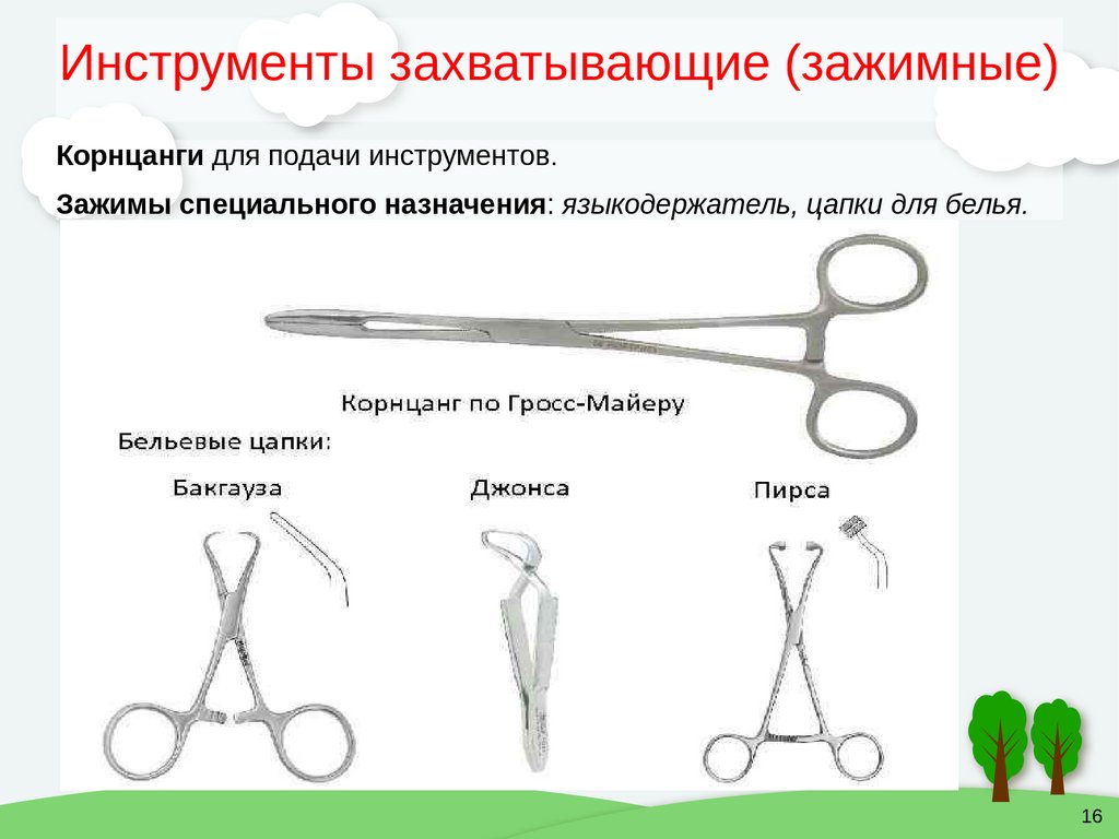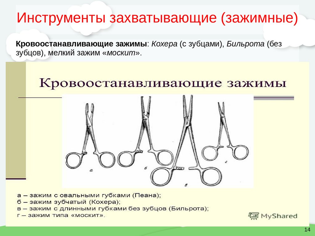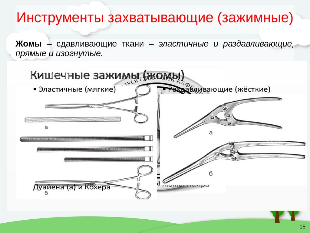 Инструменты захватывающие (зажимные)Применяются для захватывания и зажатия тканей и органов в ране с целью временной остановки