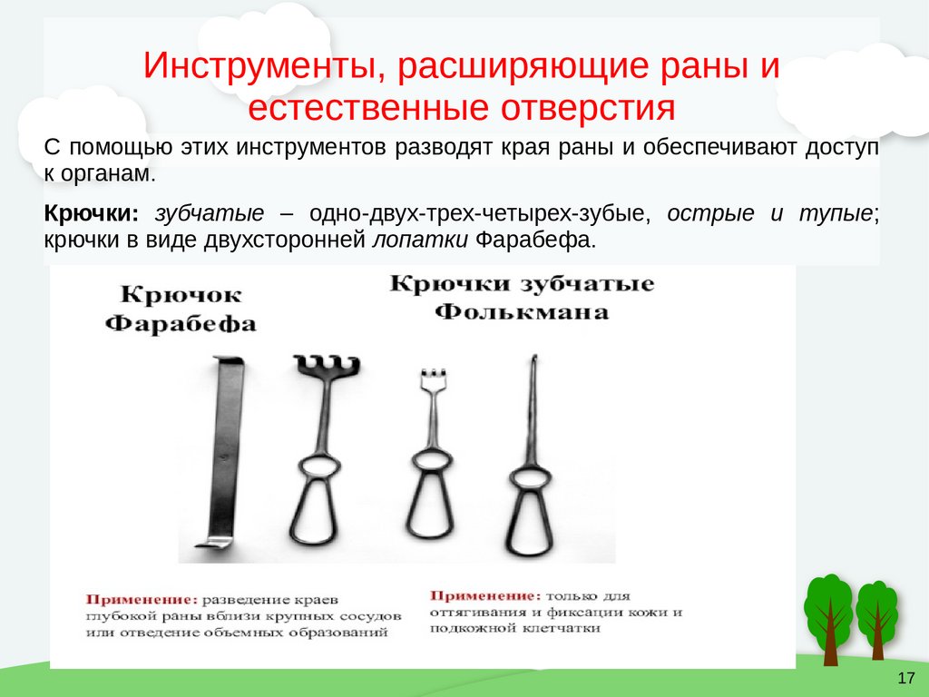 Крючки: Лангенбека в виде двухсторонней лопатки с отверстием, специальные
