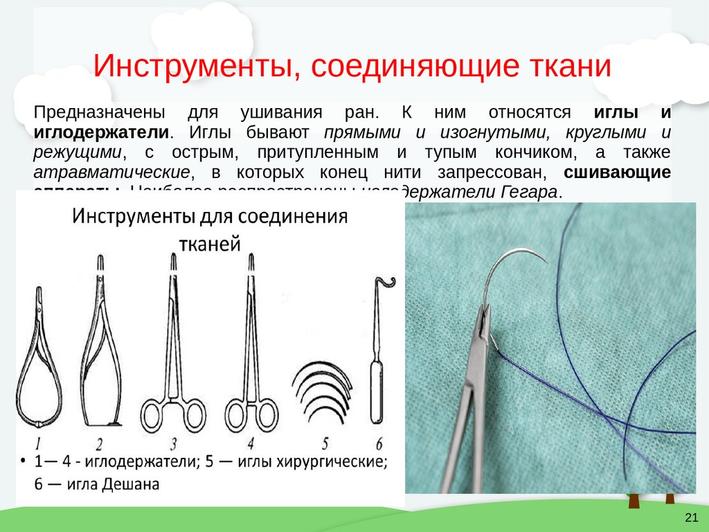 Инструменты, соединяющие тканиПредназначены для ушивания ран. К ним относятся иглы и